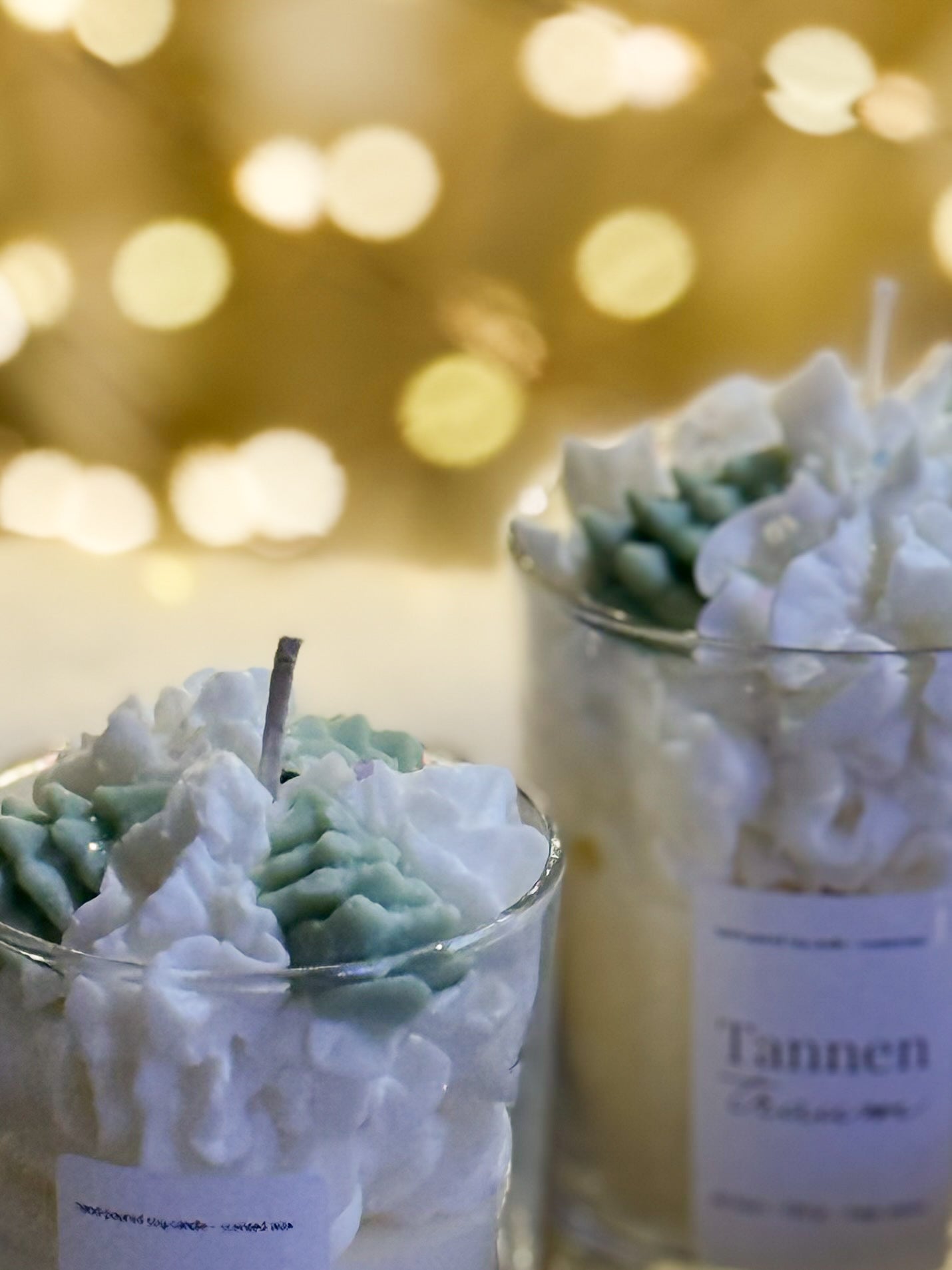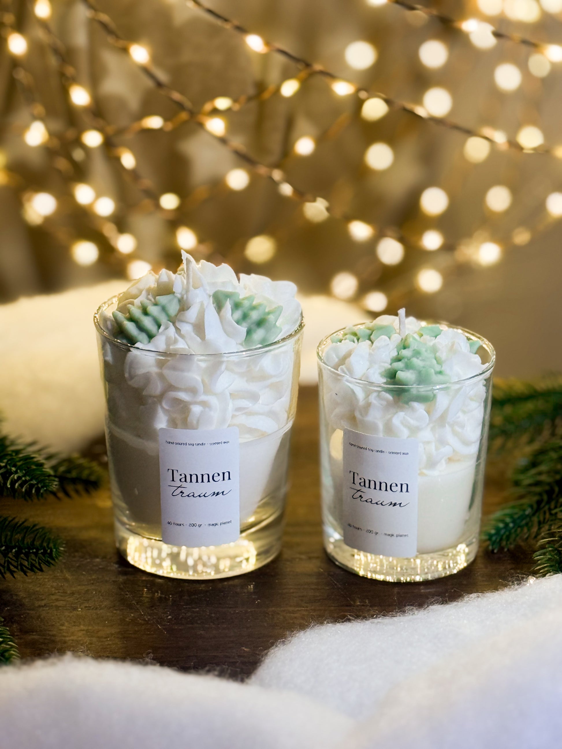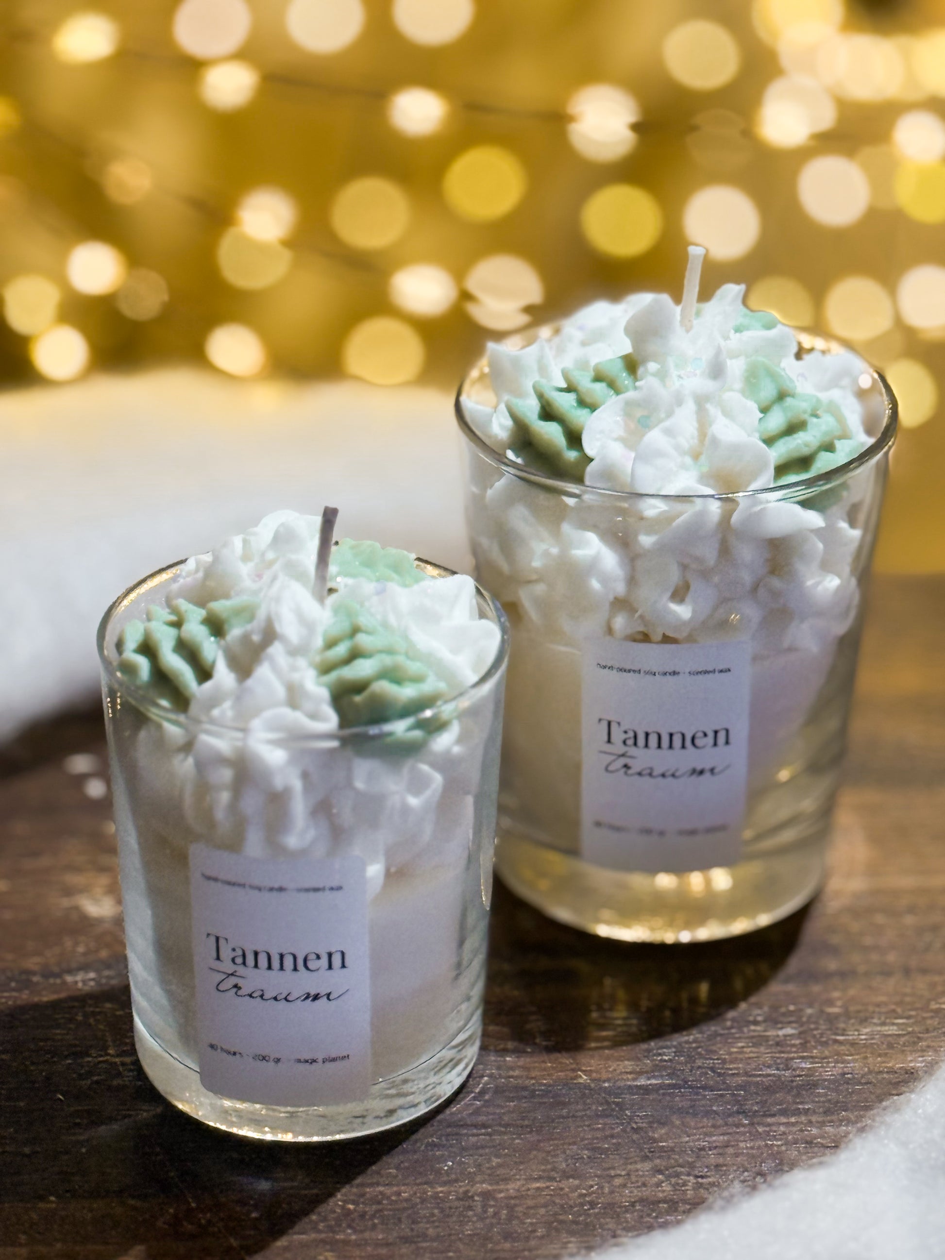 Jede Kerze wird liebevoll handgegossen und mit kleinen, grünen Wachs-Tannen verziert – perfekt für alle, die den Winter lieben.